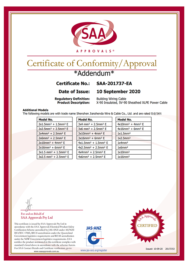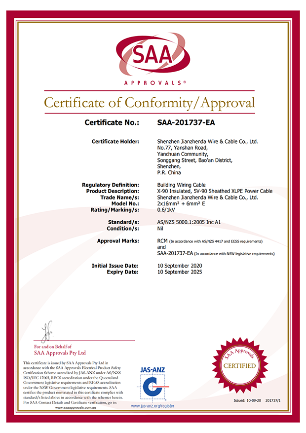 深圳建圳達電線電纜有限公司,成立于2000年,是一家電線電纜制造商,我們通過了世界各地不同市場的多數認證,如:CCC、RoHS、CB、SAA、TUV、VDE、PSE、BPS、UL、CSA。我們根據定制產品不斷更新新的認證。經過數十年的發(fā)展,我們與來自世界各地的客戶建立了長期的合作關系。我們曾經是菲律賓機場,,柬埔寨的電力站,美國的醫(yī)院,工廠,埃塞俄比亞的水電站項目。我們是一家值得信賴的電線供應商。
